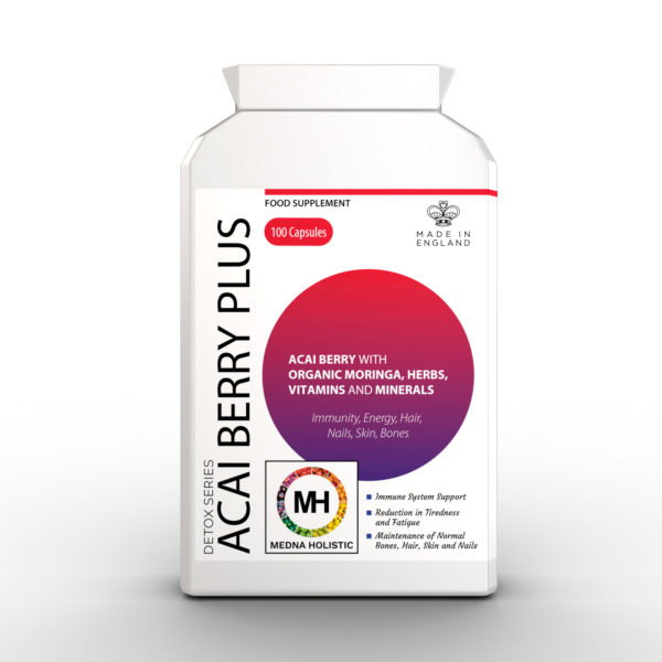 Medna Holistic Acai Berry Plus combines Brazilian freeze-dried acai berry powder and extract with a range of vitamins, minerals and herbs (including zinc, vitamin B6, biotin, organic Moringa oleifera and beetroot).