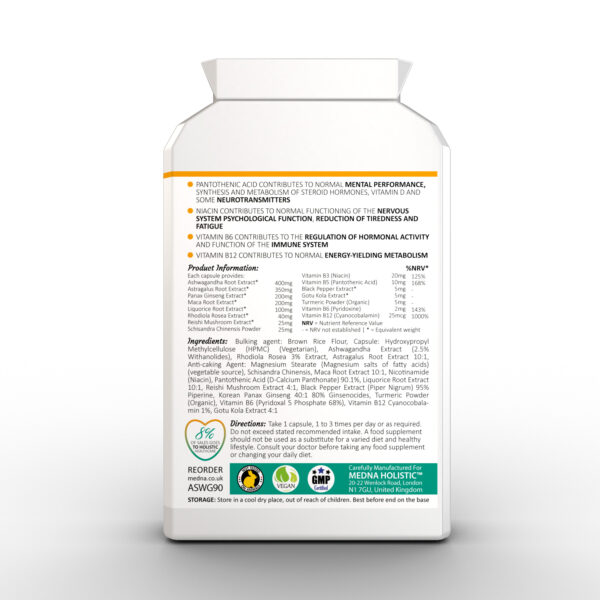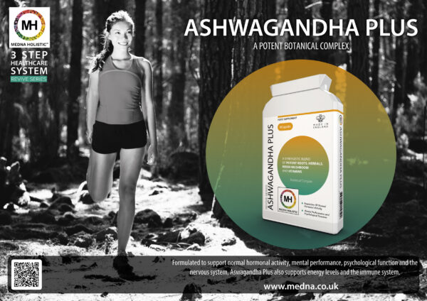 Medna Holistic Ashwagandha Plus is a synergistic combination of herbs, roots and vitamins, formulated to combat stress and adrenal fatigue, while also supporting the immune system, energy levels, mental performance and a general sense of calm, focus and vitality.