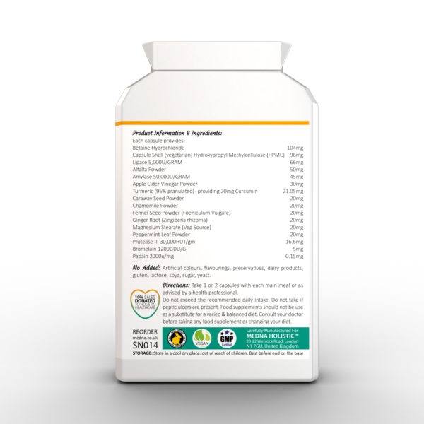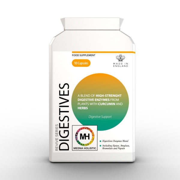 Medna Holistic Digestives belongs to the Revive Series of our 3 Step Healthcare System. Our Digestives supplement contains plant-derived enzymes (betaine hydrochloride, lipase, amylase, protease, bromelain and papain), combined with a range of herbs (alfalfa, apple cider vinegar, caraway seed, chamomile, fennel seed, ginger root, peppermint leaf and turmeric (with curcumin)).