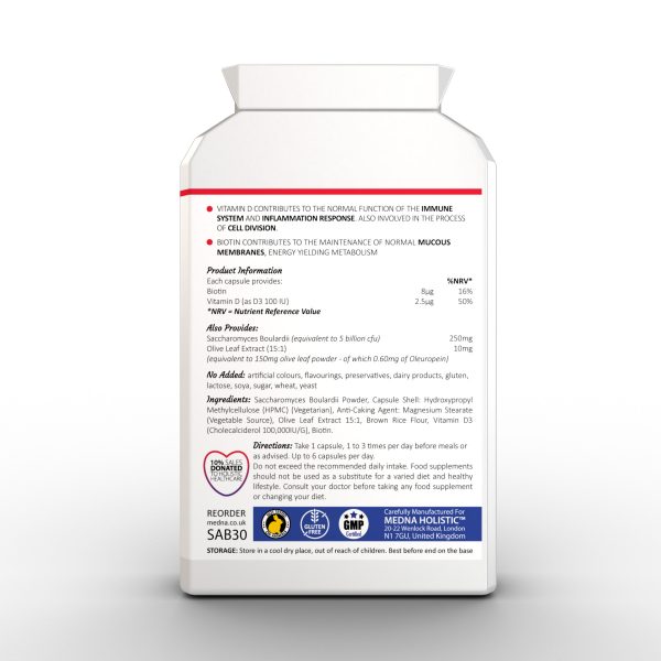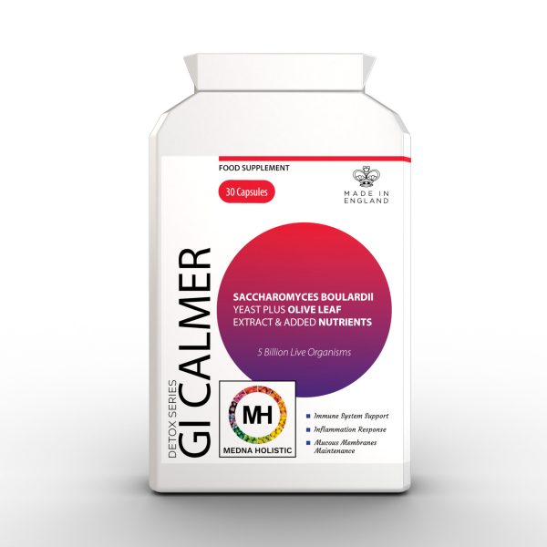 The Medna Holistic GI Calmer belongs to the Detox Series of our 3 Step Healthcare System. Our GI Calmer is a high-strength Saccharomyces boulardii yeast formula (5 billion organisms per capsule), with added olive leaf extract, vitamin D3 and biotin.