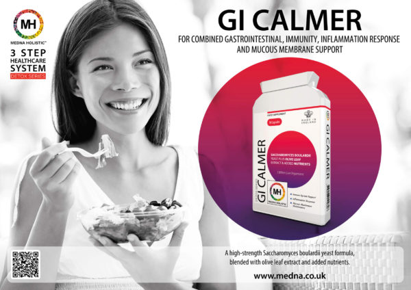 DETOX SERIES – With high-strength Saccharomyces boulardii yeast formula, the Medna Holistic GI Calmer is enriched with olive leaf extract, vitamin D3 and biotin for immune system support, inflammation response and mucous membranes maintenance.