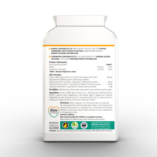 Medna Holistic Green Coffee Ultra contains green coffee bean extract (20:1) derived from “raw” unroasted coffee beans, providing the equivalent of 8000mg of green coffee bean powder. It contains 50% chlorogenic acid (CGA).